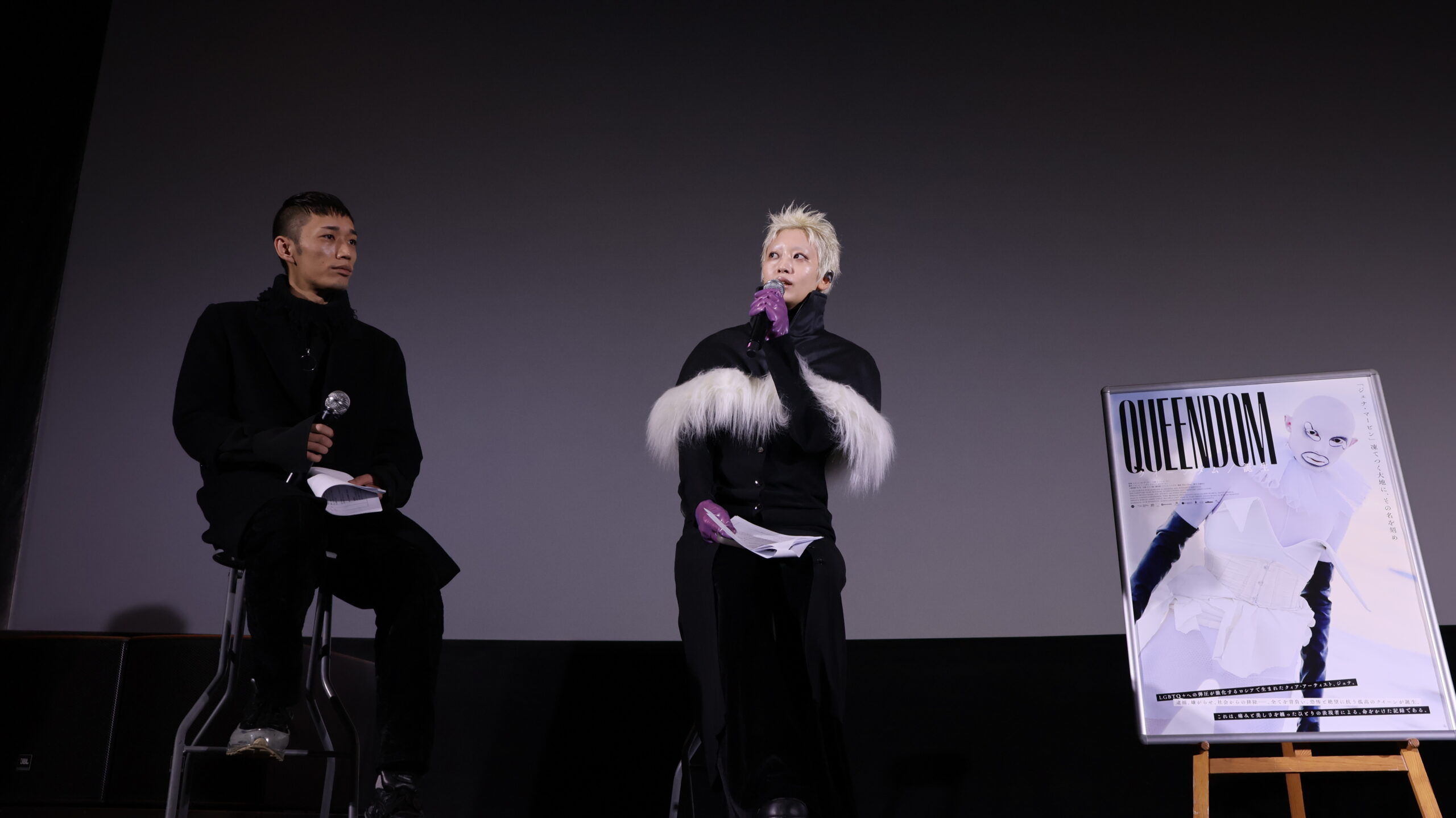 1月30日(金)シネマート新宿にて、LGBTQ+への弾圧が激化するロシアの現実を捉えたドキュメンタリー映画『クイーンダム/誕生』の公開記念舞台挨拶が行われました。 登壇したのは、本作の主人公であり、ロシアからフランスへ亡命したクィア・アーティストのジェナ・マービン氏、そしてプロデューサーのイゴール・ミャコチン氏。司会は、本作の公開に先駆け前夜祭イベントを共催したアーティストデュオMES(新井健&谷川果菜絵)が務めた。